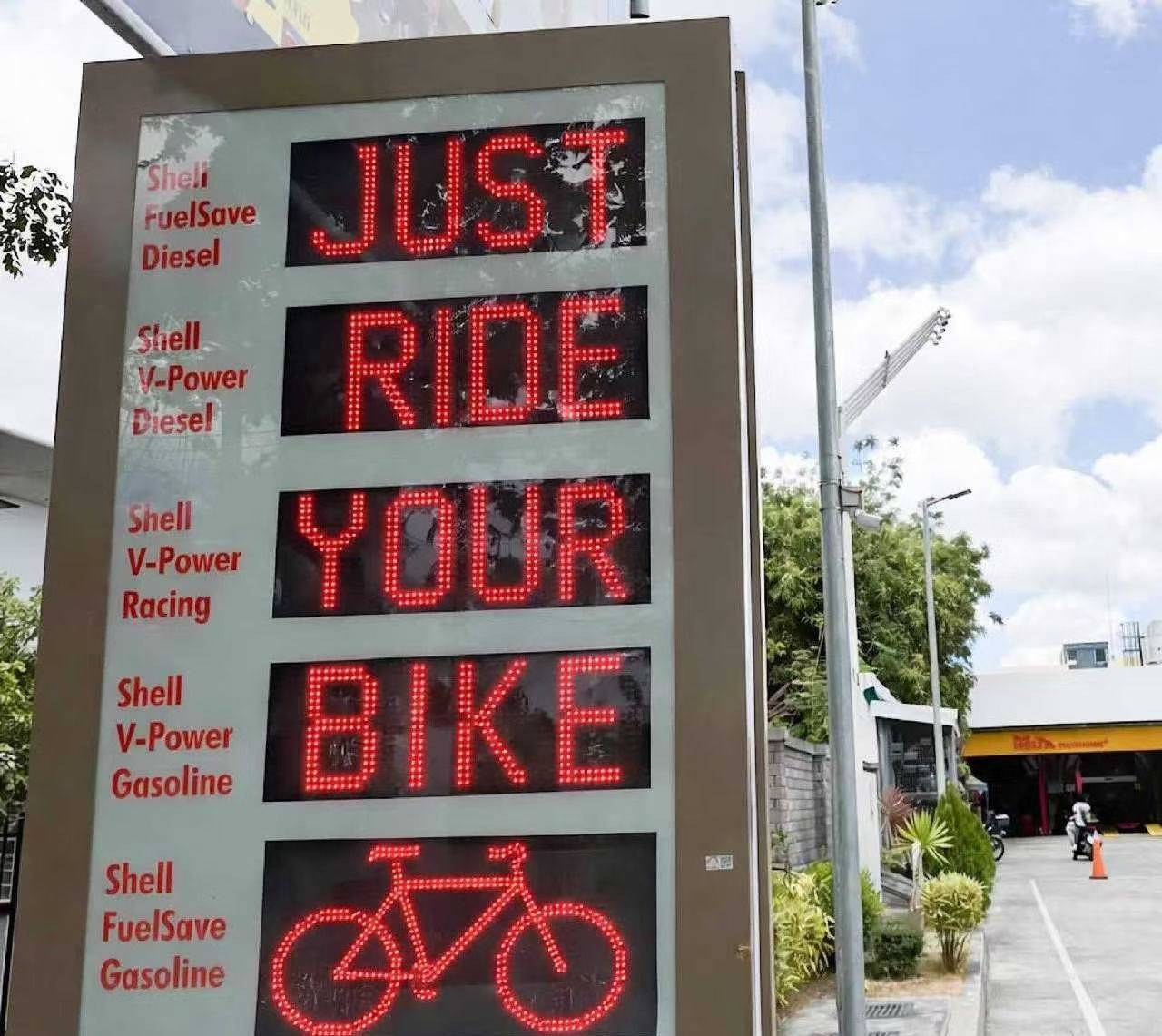 据网友发帖,菲律宾薄荷岛部分加油站已无油可加,并附上壳牌加油站的电子价格屏显示“JUST RIDE YOUR BIKE”(不如骑单车出行)的图片。有网友评论:“还好我有自行车!”“真的没油了吗?”